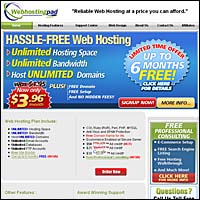Hosting Plans: Webhostingpad.com a divison of Omnis networks, was formed in 2005 with a team of very successful and proven industry veterans, intent on delivering the best value in web hosting. With the growing need of affordable hosting, the company set out to deliver the best web hosting at a price where everyone can afford to have their piece of the world wide web. Web Hosting Pad will remain committed to delivering the best value in Internet hosting by providing a safe, reliable and efficient process to create an Internet presence. All with a price structure driven by value. |